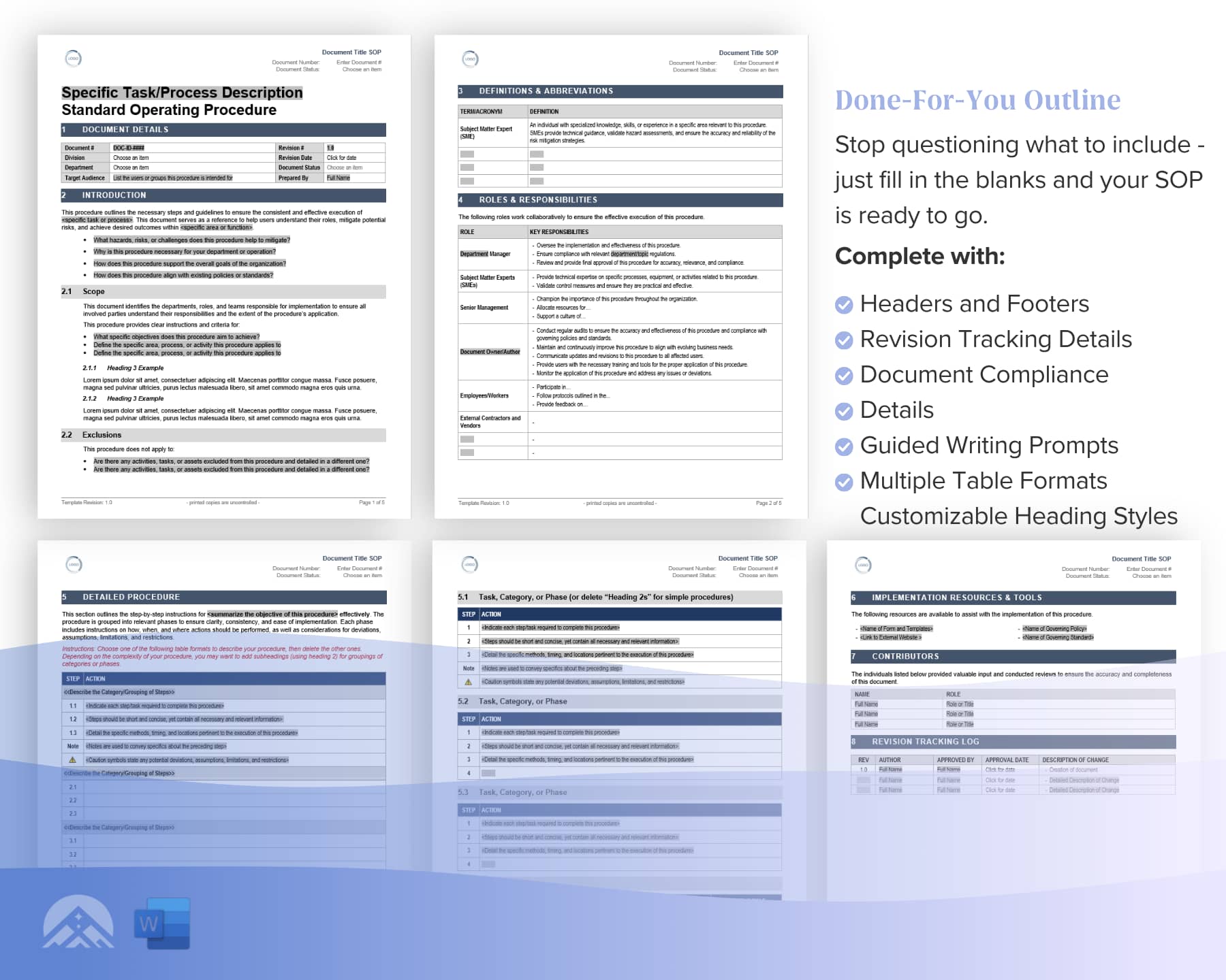 Our Modern SOP Templates include two fully customizable Word documents designed to help you create clean, audit-ready SOPs with ease. With built-in writing prompts, standard headings, and ready-to-go tables, you’ll spend less time formatting and more time creating procedures your team can actually follow.